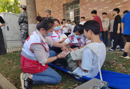 “发现伤员左前臂开放性创伤,立即止血包扎固定!”——演练现场,红会师资严格遵循应急救护规范,对模拟“擦伤”、“骨折”的伤员进行分级处置,重点演示了加压止血、骨折部位固定等技能。李金老师边操作边讲解,将急救知识融入救援行动。一名参与演练的学生表示:“看到‘伤员’出血时很紧张,但老师们的专业操作让我记住了急救要点,这样的演练比课堂更生动。